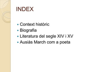 Poema XXXIIIISens lodesig de cosadeshonesta, d’onve dolor a tot enamorat,viscdoloritdesitjantseramat,e par-ho béque no us vulldeshonesta.Çoquejoambvósésvostresenye los estats de vostravidacasta:molt no deman, car mondesig no bastasinó en çoquehonestatateny.IIL’enteniment a vósamarm’empenye no lo cosabvolerdeshonest:tira’m a vós un amigable gest, absentir prim qui estadespertadesdeny.Tantestàpres lo meuentenimentper molta part de vostreque li altaqueemtolsentir e emfa la carnmalaltad’un taldormirqueperd lo sentiment.(…)VIPlena de seny, monentenimentfermeEn çoquemaiamador lo fermàE, sifallesc, veraamorfallirà.Mellor de tots hauré nom, si·mconferme.