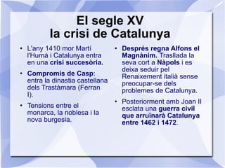 El segle XVla crisi de Catalunya L'any 1410 mor Martí l'Humà i Catalunya entra en una crisi succesòria. Compromís de Casp : entra la dinastia castellana dels Trastàmara (Ferran I). Tensions entre el monarca, la noblesa i la nova burgesia. Després regna Alfons el Magnànim. Trasllada la seva cort a Nàpols i es deixa seduir pel Renaixement italià sense preocupar-se dels problemes de Catalunya. Posteriorment amb Joan II esclata una guerra civil que arruïnarà Catalunya entre 1462 i 1472 .