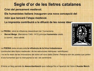 Segled’or de les lletres catalanes Crisi del pensament medieval. Els humanistes italians inauguren una nova concepció del món que tancarà l’etapa medieval. La impremta contribuirà a la difusió de les noves idees. La PROSA rebrà la influència classicitzant de l’ humanisme. Bernat Metge (Barcelona 1340- 1413) principal humanista català. Lo somni , obra cabdal. La POESIA resta encara sota la influència de la lírica trobadoresca (continuïtat dels tòpics medievals i de les estructures mètriques i estròfiques) i no es fa ressò de les innovacions del dolce stil novo italià (Dante i Petrarca són els poetes que parlen d’una humanitat que no menysprea la raó i els sentiments S’inicia un llarg període de desoccitanització que s’allarga fins a l’aparició de l’obra d’ Ausiàs March .