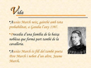 V ida Ausiàs March neix, gairebé amb tota probabilitat, a Gandia l’any 1397. P rocedia d’una família de la baixa noblesa que formà part també de la cavalleria. A usiàs March és fill del també poeta Pere March i nebot d’un altre, Jaume March .