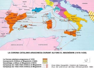 R ei deCatalunya-Aragó (1416-58) i de Nàpols (1442-58). Fou el primogènit de Ferran d’Antequera. Q uan vingué a Catalunya ja tenia 18 anys, i se’l considerava tan estranger com el seu pare. Les primeres intervencions a les Corts foren en castellà, per la qual cosa es guanyà els recels de la vassallia. A lfons el Magnànim Moneda anomeda “alfonsina” encunyada per la Corona després de la conquesta de Nàpols.