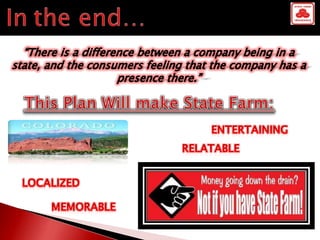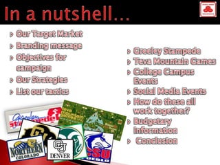 The document outlines a marketing strategy aimed at college students in Colorado, focusing on innovative tactics and local engagement to increase State Farm's presence. Key components include participation in local events, the use of social media, and direct outreach to connect with the target demographic. The financial breakdown suggests a total cost of $150,000 for planned events and initiatives throughout the year.
