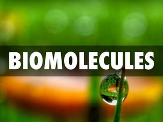 Biomolecules are groups of atoms containing more than one element that are involved in maintaining and metabolic processes of living organisms. There are four main types of biomolecules: carbohydrates, lipids, proteins, and nucleic acids. Carbohydrates are made of carbon, hydrogen, and oxygen and function as an energy source. Lipids also contain carbon, hydrogen, and oxygen and function to store energy. Proteins contain carbon, hydrogen, oxygen, and nitrogen and function in building and repairing cells as well as speeding up or slowing down chemical reactions. Nucleic acids contain carbon, hydrogen, oxygen, nitrogen, and phosphorus and function to store genetic information and determine physical appearance.