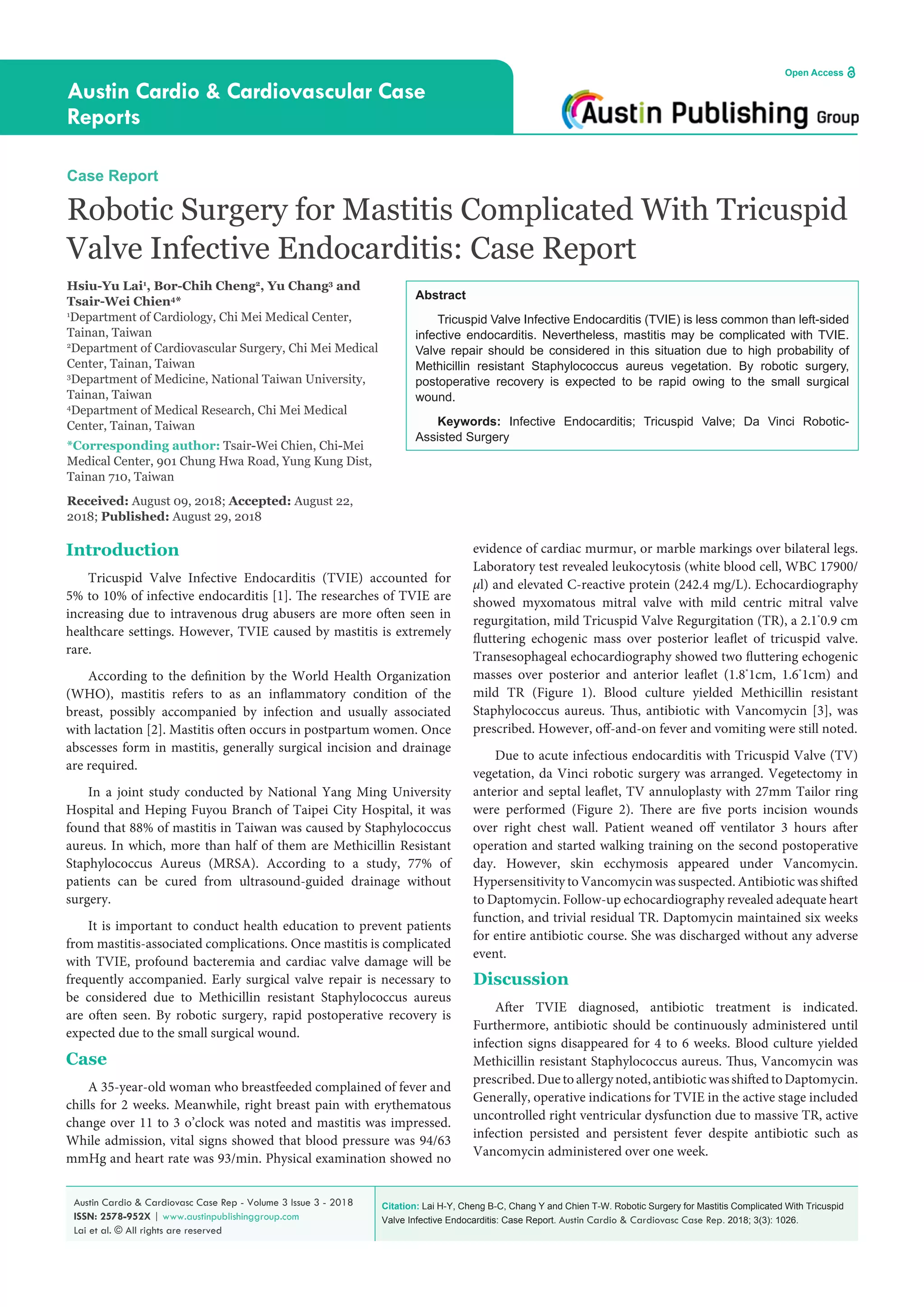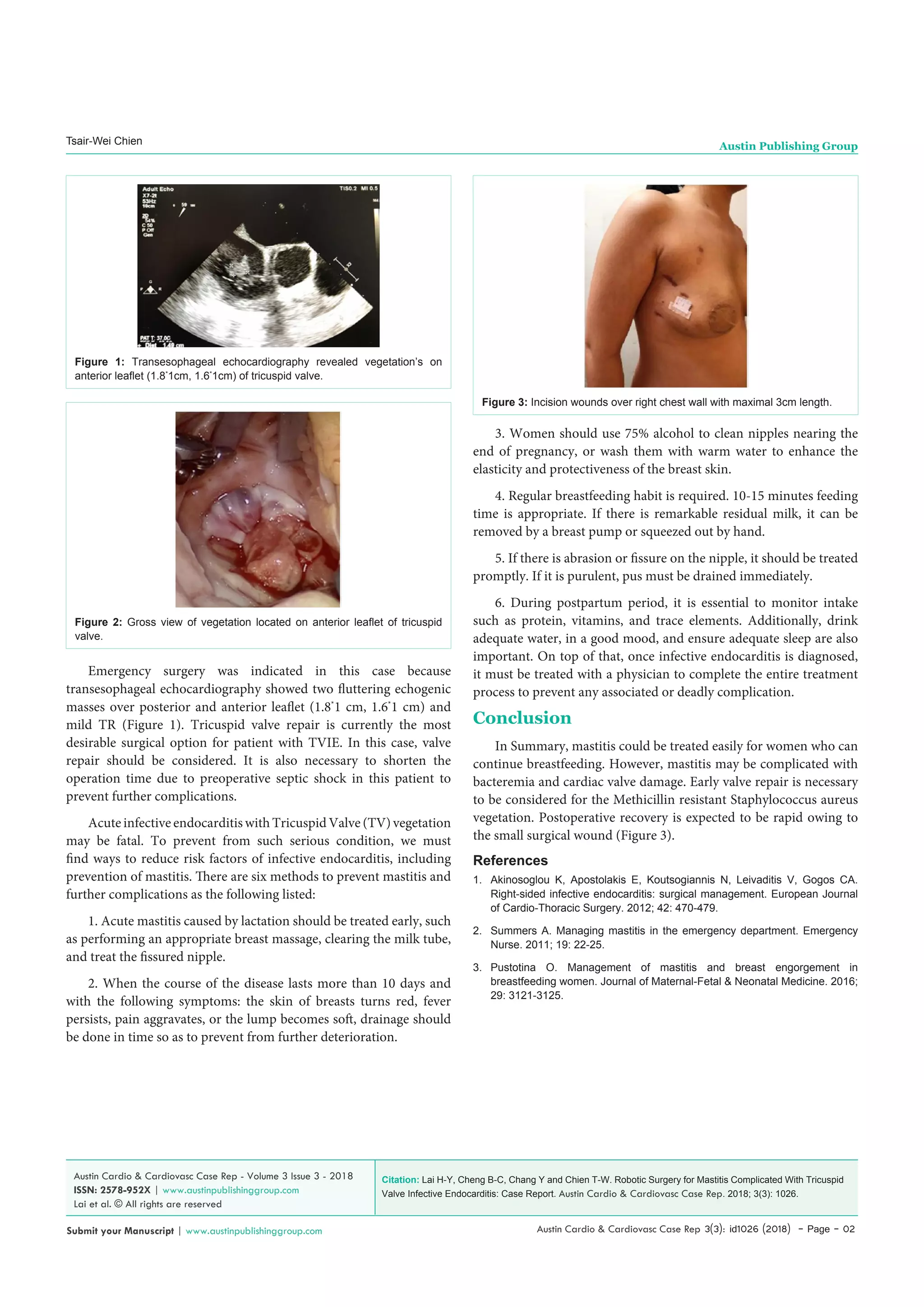 This case report discusses the rare occurrence of tricuspid valve infective endocarditis (TVIE) complicated by mastitis, emphasizing the importance of early surgical valve repair due to the prevalence of methicillin-resistant Staphylococcus aureus. The patient, a 35-year-old woman, underwent robotic surgery, resulting in rapid postoperative recovery, and was successfully treated with daptomycin after an allergic reaction to vancomycin. The report highlights preventive measures against mastitis and the need for timely intervention to avoid serious complications.