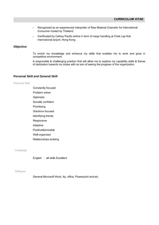 Mr. Austin Rujipuritanon is currently pursuing a Master's degree in Business Management and Logistics. He has over 5 years of experience in logistics and supply chain roles. His experience includes positions in operations management, container control, and strategy analysis. He is proficient in English and Microsoft Office software. His objective is to continue enhancing his skills and contributing to organizational progress.