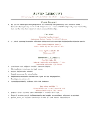 Austin Lindquist is seeking a career that allows him to grow through experiences, relationships, and work. He has over 5 years of experience in food service and retail roles, including as a cashier, kitchen staff, and delivery driver at restaurants like Chick-fil-A, Papa John's, and Babe's Chicken House. Lindquist also has over 3 years of experience working in grocery, dairy, and meat departments at Kroger, where he provided excellent customer service and stocked inventory. He is proficient in Spanish and American Sign Language and has strong communication, customer service, and problem-solving skills.