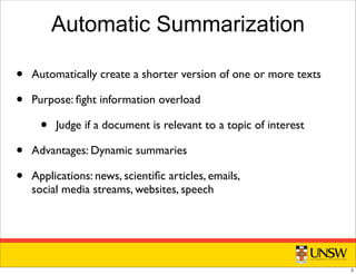 This document discusses techniques for automatically summarizing legal texts. It presents methods for combining different summarization techniques, including content selection through sentence extraction using topic models, graph-based methods, and supervised techniques. It also describes preprocessing legal texts, building corpora from case law reports, and evaluating summaries using ROUGE metrics. The goal is to help users efficiently access and understand large collections of legal documents and texts.