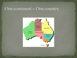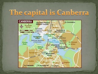 Native people first arrived in Australia around 1770. Later, convicts were sent from England and Ireland to Australia as punishment. Some key facts about Australian animals include that kangaroos and emus cannot walk backwards, male kangaroos can leap over 9 meters, and the smallest is the musky rat-kangaroo. Hardiness was needed for the tough pioneer lifestyle in Australia. Sydney opera house is a famous landmark. Wombats leave square-shaped dung to help them find their way home through smell.