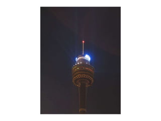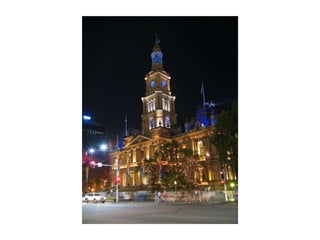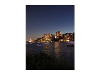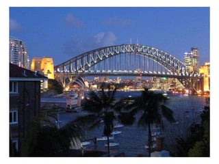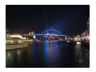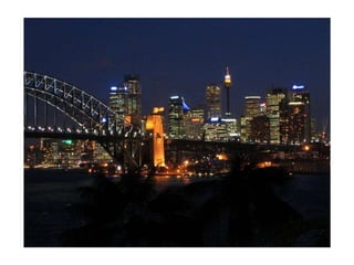 Sydney is known for iconic landmarks like the Sydney Opera House and Harbour Bridge, as well as festivals and events held there, including fireworks displays from the Harbour Bridge. The document also references nocturnal views of the city, storms, and native wildlife like kangaroos and koalas that can be found near Sydney.