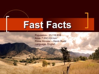 - Australia has a population of over 23 million people and is the 6th largest country by area. Its capital is Canberra.