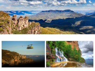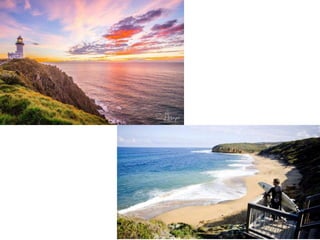 Australia is located in the Southern Hemisphere, so its seasons are opposite of Europe's. It is the 6th largest country by size, smallest continent, and an island surrounded by water. Australia is composed of 7 territories and uses the Australian dollar. Its flag represents its historical link to Britain. Some notable places to visit include Sydney, beaches, the Gold Coast, Great Ocean Road, Kangaroo Island, and Lake Hillier.