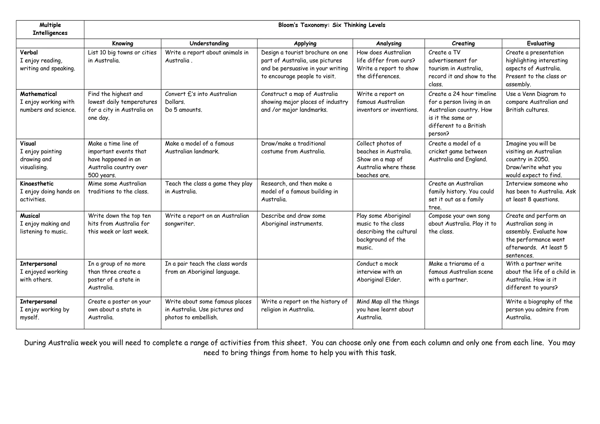 Bloom's Taxonomy outlines six levels of thinking skills: remembering, understanding, applying, analyzing, evaluating, and creating. The document provides examples of activities for students to complete during an Australia week that target different thinking levels and multiple intelligences. Students can choose one activity from each column and row to learn about various topics related to Australian culture, history, geography, and more through hands-on projects, writing, research, creative works, and presentations.