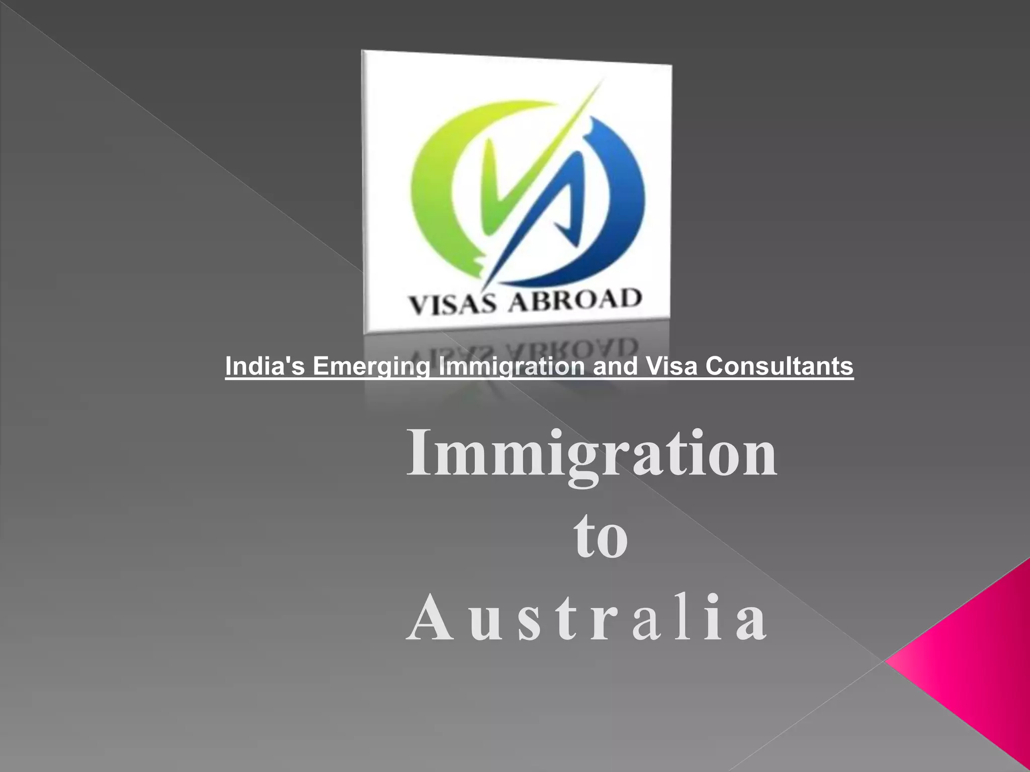 The document discusses various types of visas available for immigration, travel, study, and work in Australia. It outlines the visa categories for migrants, visitors, students, employers, and business. It notes that citizenship can be obtained after 4 years of living in Australia and that Australia invites skilled immigrants in areas of shortage. The document also provides contact information for an immigration consulting firm that can assist with applications.