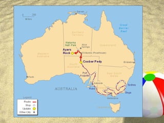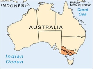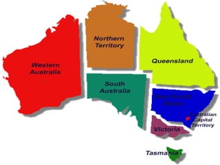 2) It also outlines Australia's political divisions, naming the 6 states and 2 territories, and providing some details about each.