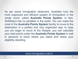 The Australia Points System is a structured immigration process requiring candidates to score at least 60 points based on age, work experience, English language proficiency, and education for visa subclasses 189, 190, and 489. Points are awarded differently depending on age groups, work experience in Australia or abroad, and qualifications recognized by Australian authorities. Additionally, applicants must have their skills listed on the Skilled Occupation List to be eligible for permanent residency.