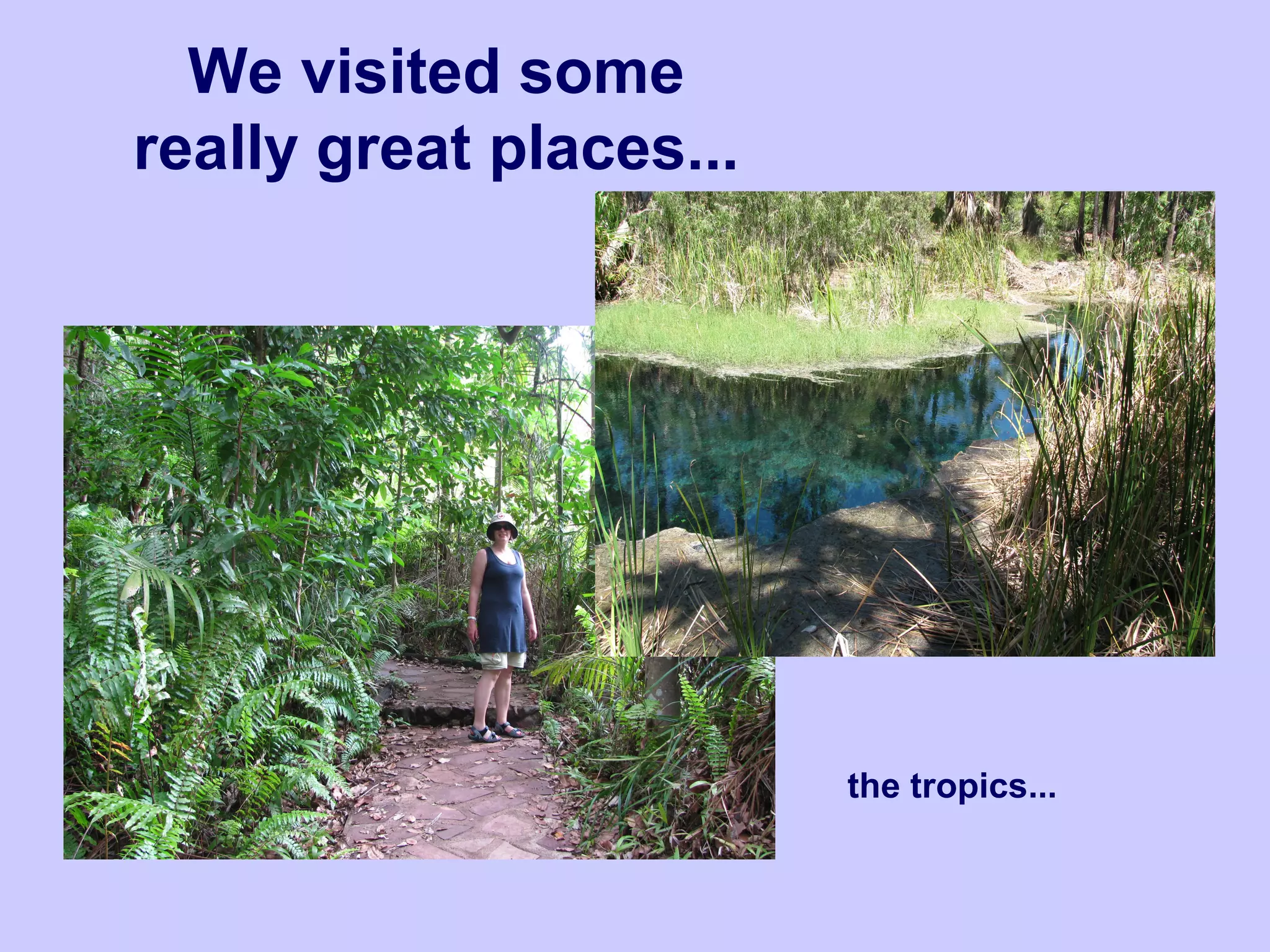 The document describes a trip where the author visited remote natural landmarks like waterfalls, hot springs, and campsites across tropical and remote areas, as well as passing famous local landmarks like the "sorry tree" and Elsey Station. The trip also included encounters with Australian wildlife like kangaroos and the rare big red kangaroo while traveling between these scenic and historic destinations.