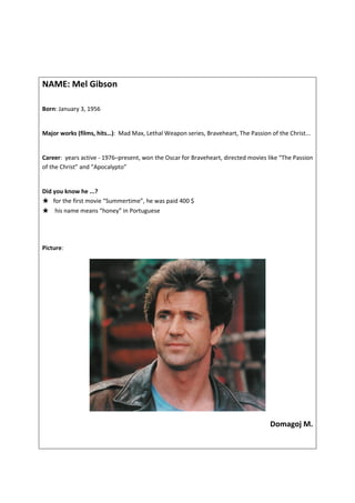 Mel Gibson is an Australian actor and filmmaker born in 1956. Some of his most notable roles were in the Mad Max films and the Lethal Weapon series. He gained critical acclaim for directing and starring in Braveheart, which won the Academy Award for Best Picture. Gibson has also directed other successful films like The Passion of the Christ and Apocalypto. He is known for often playing angry or deranged characters and has faced controversies over alleged racist and anti-Semitic remarks.