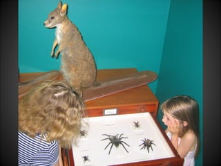 The document describes a trip through the Australian Museum where a group saw various exhibits including Indigenous art, dinosaurs, native animals, insects, skeletons, snakes, sharks, birds, crocodiles and gemstones. The outing was a great success and fun experience for all involved. Visitors are invited to return next week for another excursion through the museum.