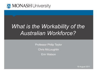 This presentation provides an overview of research on work ability in Australia. It discusses the development of the concept of work ability and measurement tools like the Work Ability Index. The researchers developed a new survey, the Work Ability Survey, to address limitations of the WAI. It explains current research using the WAS to study four organizations. Upcoming work on the Work Ability Survey Revised aims to develop an improved nationally representative measure of work ability based on a theoretical model.