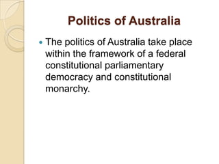 Australia has a federal parliamentary democracy and constitutional monarchy. The political system is based on British and North American models but has unique Australian aspects. The system consists of a Commonwealth Parliament made up of the Senate and House of Representatives, as well as an executive government. Queen Elizabeth II is Australia's head of state, while the Governor-General represents her and performs ceremonial duties. State and local governments handle areas like education, health, and infrastructure within their jurisdictions. Relations between the levels of government involve cooperation in shared policy areas.