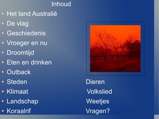 Inhoud Het landAustrali ë De vlag Geschiedenis Vroeger en nu Droomtijd Eten en drinken Outback Steden Dieren Klimaat Volkslied Landschap Weetjes Koraalrif Vragen?