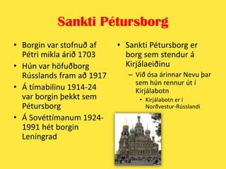 Sankti PétursborgBorgin hefurlengi verið kölluð gluggi Rússlands að vestrinuÞar má finna margar fallegar byggingar svo sem:VetrarhöllinaSumarhöllinaUm 5 milljónir búa í borginniMargir ferðamenn heimsækja hana til að kynna sér sögu hennar