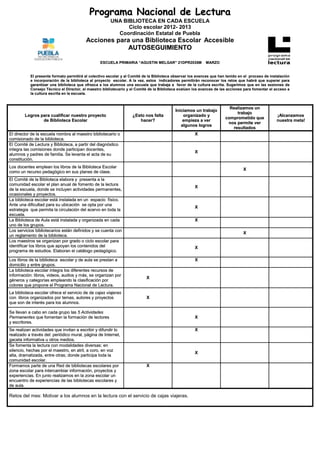 EEll pprreesseennttee ffoorrmmaattoo ppeerrmmiittiirráá aall ccoolleeccttiivvoo eessccoollaarr yy aall CCoommiittéé ddee llaa BBiibblliiootteeccaa oobbsseerrvvaarr llooss aavvaanncceess qquuee hhaann tteenniiddoo eenn eell pprroocceessoo ddee iinnssttaallaacciióónn