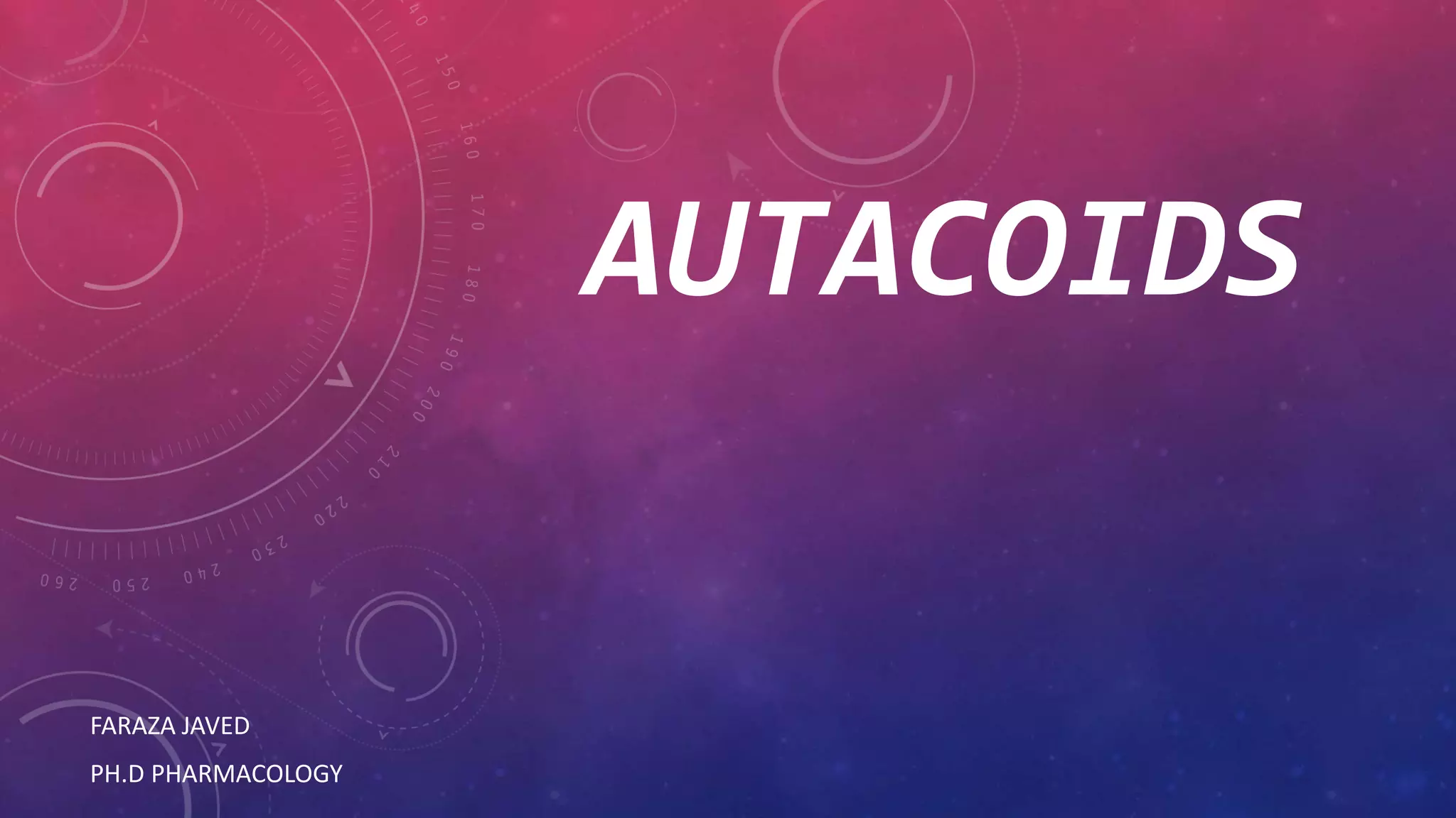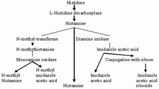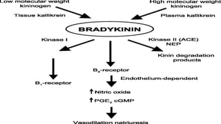 Histamine and bradykinin are important autacoids or local hormones that act near their site of synthesis to exert physiological effects. Histamine is released from mast cells and basophils during allergic reactions and binds to H1, H2, H3 and H4 receptors, causing effects like vasodilation, increased vascular permeability, and bronchioconstriction. It is involved in allergic diseases. Bradykinin is produced from kininogen and acts on B1 and B2 receptors to cause vasodilation, smooth muscle contraction, increased vascular permeability and pain. Both histamine and bradykinin are inactivated by enzymatic degradation and their effects can be blocked by receptor antagonists.