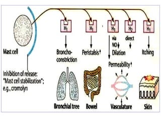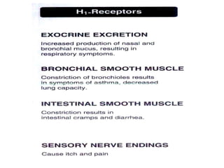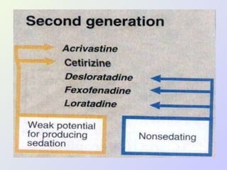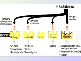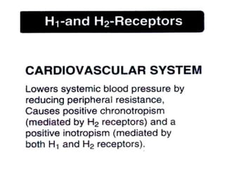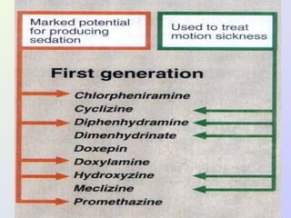 The document discusses autacoids and focuses on histamine and antihistamines. It notes that histamine is derived from the amino acid histidine and is found in tissues like lungs, skin, and the gastrointestinal tract. Histamine causes inflammatory and allergic reactions by binding to H1 and H2 receptors. Antihistamines work by blocking these histamine receptors. First generation antihistamines often have anticholinergic effects and sedation as side effects, while second generation antihistamines generally do not. Antihistamines are used to treat allergic disorders, motion sickness, nausea/vomiting, and anaphylaxis. Their side effects include dry mouth, urinary retention, sedation