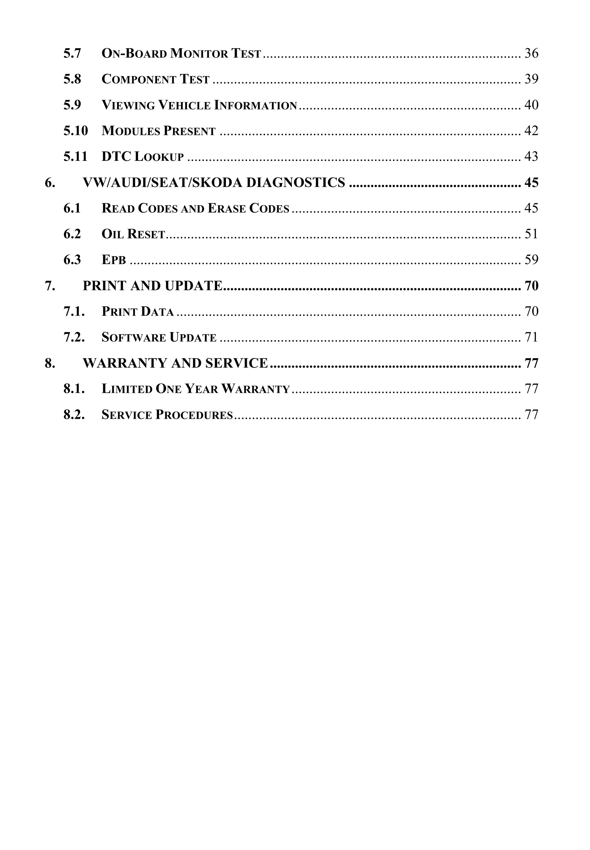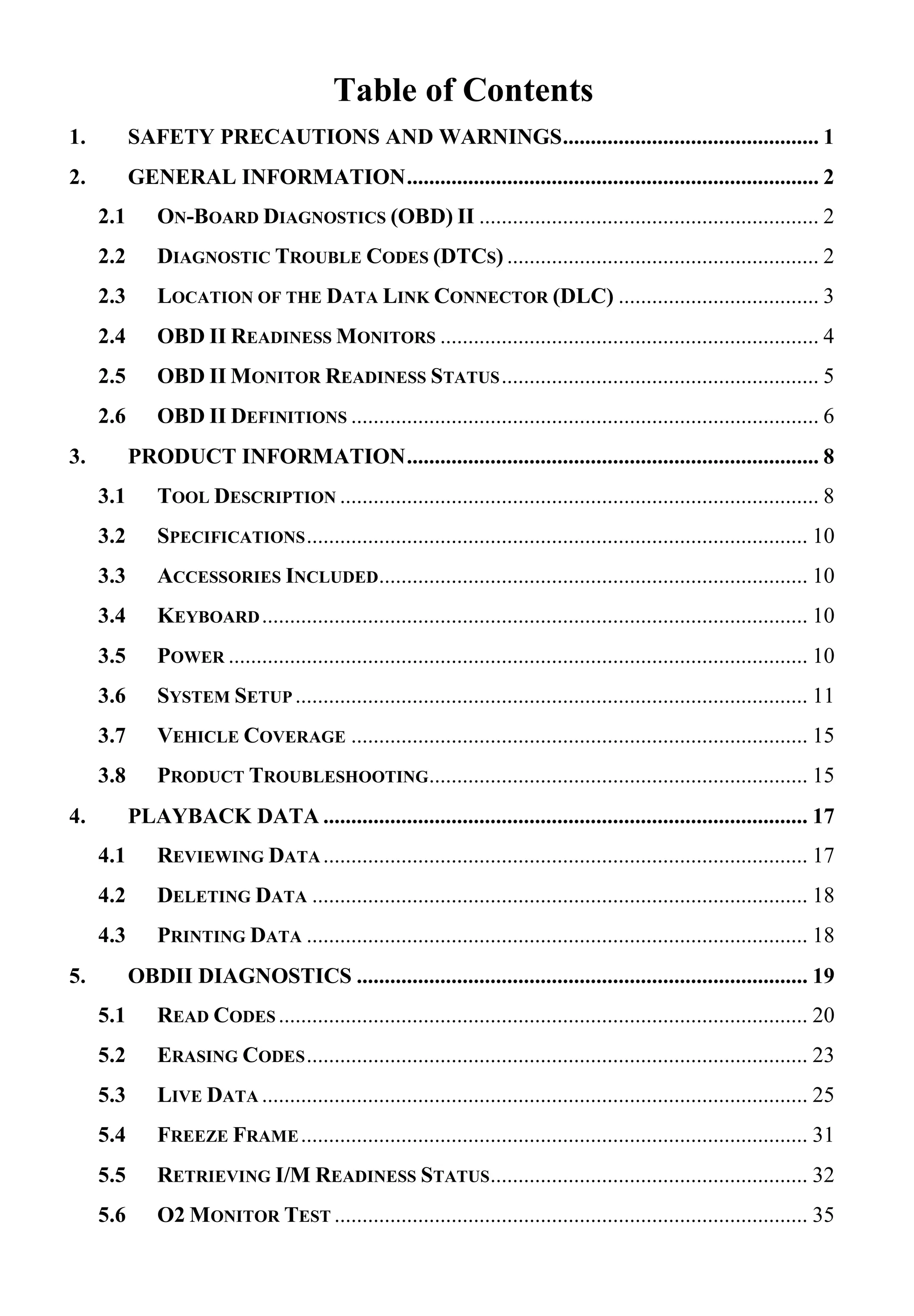 The document outlines essential safety precautions, general information about on-board diagnostics (OBD) II systems, and detailed product information regarding a diagnostic scan tool. It describes the tool's functionalities, including code reading, erasing, live data monitoring, and system setup, along with specifications and included accessories. Additionally, it explains the significance of OBD II readiness monitors, diagnostic trouble codes (DTCs), and operational guidelines for effective vehicle diagnostics.