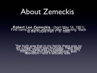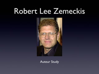 Robert Lee Zemeckis is an American film director known for films portraying isolation and loneliness. Some of his most famous films are Back to the Future, Cast Away, and Forrest Gump. Zemeckis did not grow up in an artistic household but found inspiration in television. He sees himself using film as a medium for personal expression, as described by auteur theory. In Cast Away, Chuck is completely isolated after being stranded on an island alone. Back to the Future shows Marty isolated in another time. Forrest Gump highlights Forrest's isolation despite being surrounded by people. Zemeckis explores these themes of isolation through techniques like long takes with no music on Cast Away to immerse the viewer in the