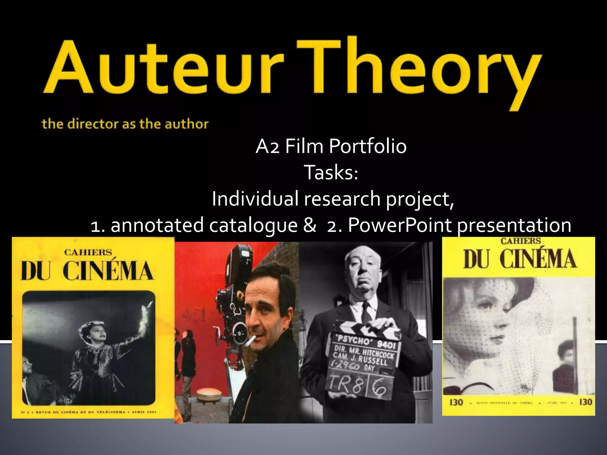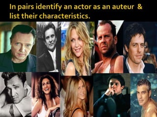 This document provides information about auteur theory in film. It discusses how auteur theory views the director as the primary author or "auteur" of a film, with the director's personal style and recurring themes appearing across their body of work. The document traces the origins of auteur theory through the work of French critics in the 1950s-60s and discusses how it gave more power to directors. It also examines some criticisms of auteur theory and considerations of other potential "auteurs" like producers, actors, or stars. Overall, the document serves as a useful introduction and overview of auteur theory in cinema.