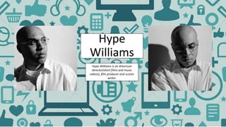 Hype Williams is an American director, producer and screenwriter known for directing music videos for famous rap and R&B artists like Beyoncé, Kanye West, and Jay-Z. He is recognized for his distinctive use of fish eye lenses and has won awards for his work. Some of his most famous music videos include Beyoncé's "Drunk in Love", Future's "I Won", and Kanye West's "All of the Lights" and "Heartless". His videos typically feature popular artist locations in America and focus on the artist, with techniques like flashing lights, editing, and lip syncing.