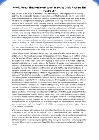 David Fincher's film Fight Club effectively demonstrates auteur theory through Fincher's signature directorial style. Fincher uses consistent elements like muted color palettes, deliberate camera shots that guide the audience's gaze, and unconventional character introductions. The film also reflects Fincher's artistic vision through its unreliable first-person narration and fractured narrative structure. Analyzing Fight Club through the lens of auteur theory highlights how Fincher exerts authorial control over his work and influences audiences through his distinctive cinematic techniques.