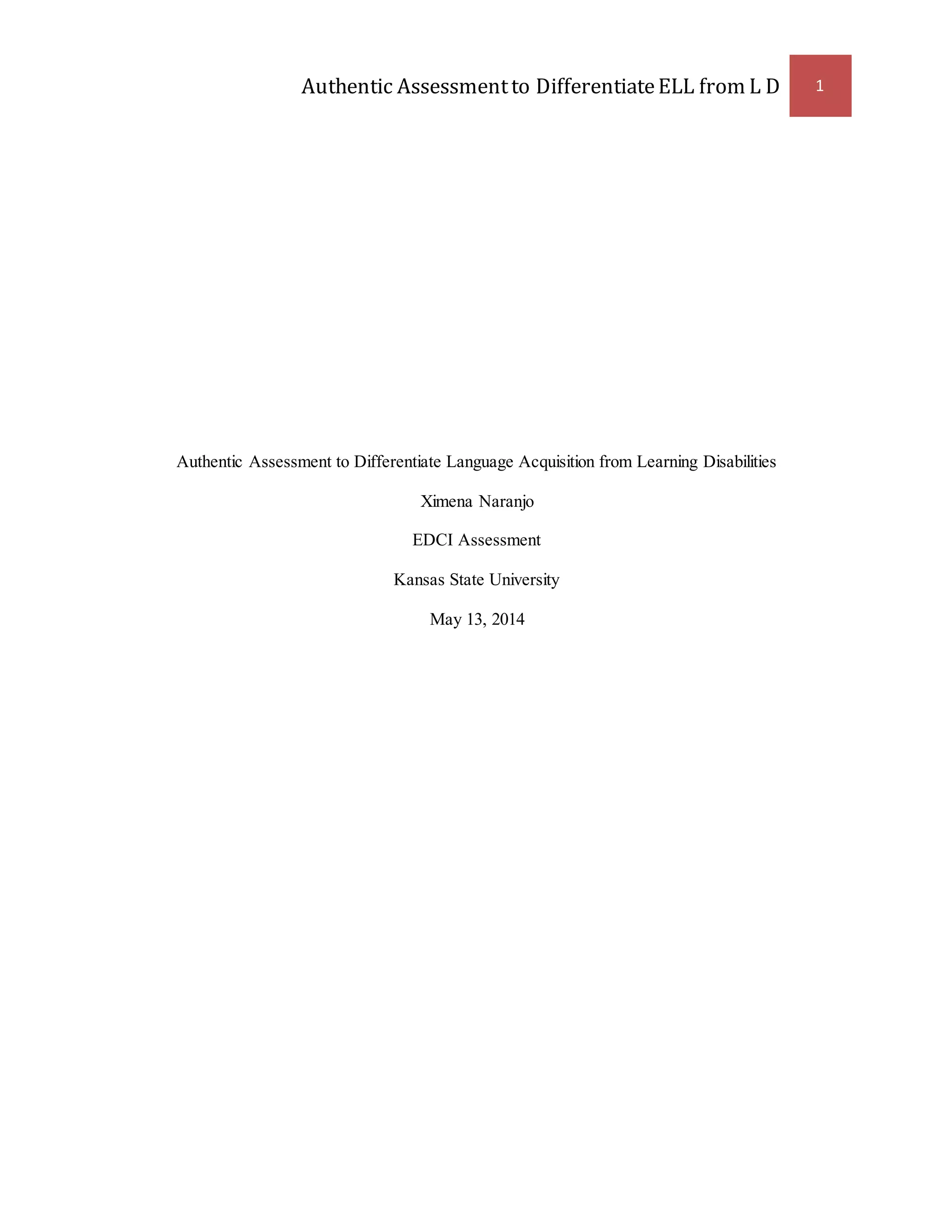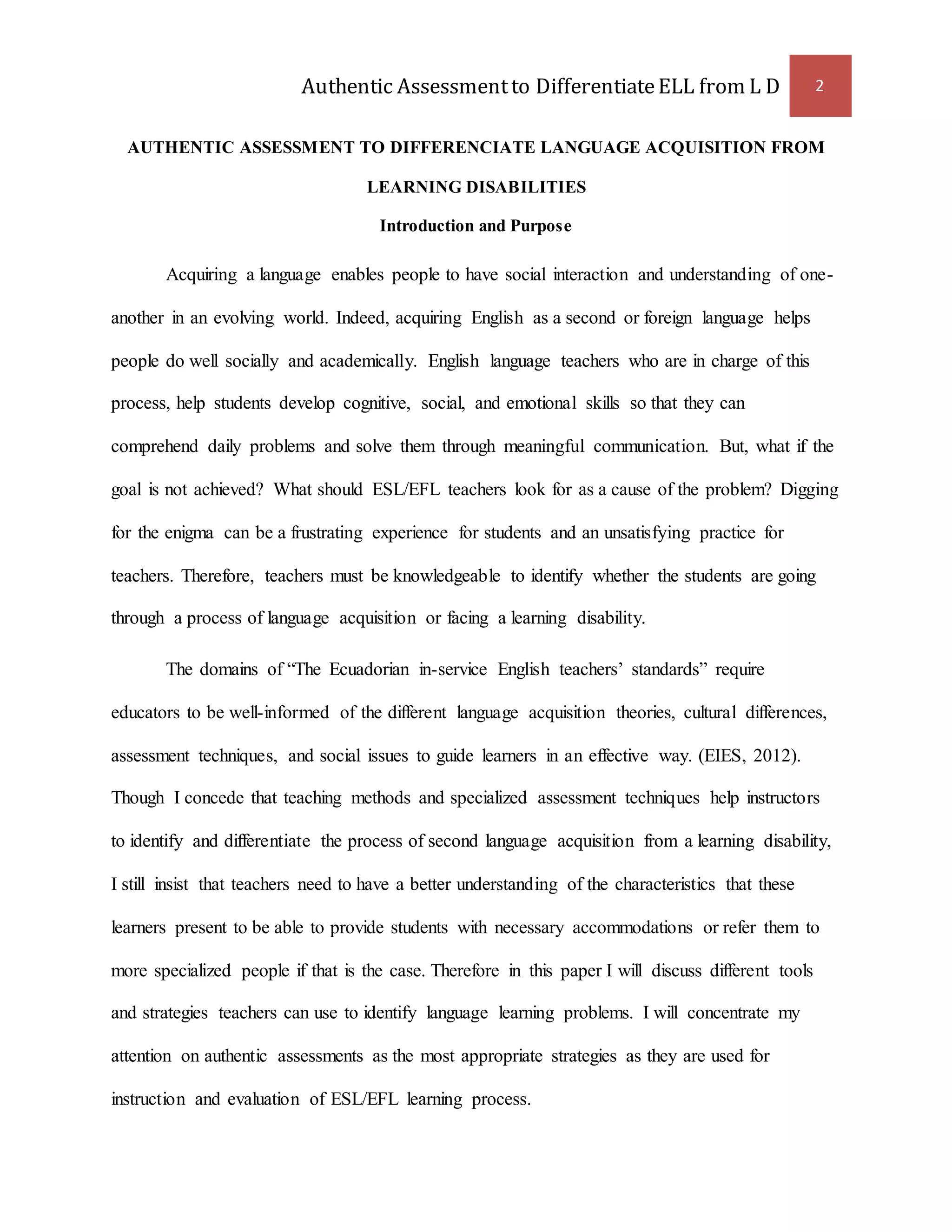 This document discusses using authentic assessment to differentiate between students experiencing language acquisition versus those with learning disabilities. It defines language acquisition as being influenced by social and cognitive factors, while learning disabilities are neurological issues. Several assessment tools are described that can help teachers identify students' challenges, including the Modern Language Aptitude Test, pre-referral assessments, and authentic assessments involving real-world tasks. Authentic assessment is recommended as it evaluates higher-order thinking skills and allows progress monitoring during instruction.