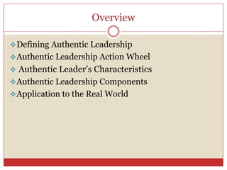 This document defines authentic leadership and its key components. Authentic leadership focuses on genuine leadership that increases self-awareness. It is developed through positive psychology and organizational contexts. The Authentic Leadership Action Wheel outlines six features of leadership actions: meaning, mission, power, structure, resources, and existence. Authentic leaders display characteristics like understanding their purpose, strong values, trusting relationships, self-discipline, and acting from the heart. There are four components of authentic leadership: self-awareness, internalized moral perspective, balanced processing, and relational transparency. Authentic leadership aims to serve others and do what is right.