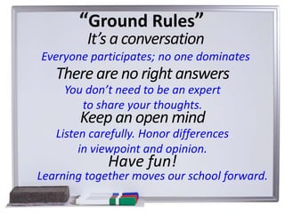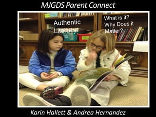 This document discusses authentic literacy and its importance. It begins by asking what authentic literacy is and why it matters. It then provides ground rules for the conversation, emphasizing that everyone should participate respectfully and keep an open mind. The document goes on to ask questions about the goals of literacy instruction and what real readers and writers do. It mentions community and authentic assessment. It concludes by encouraging participants to not be afraid of real learning and to share one thing they learned or a new idea they want to think more about.
