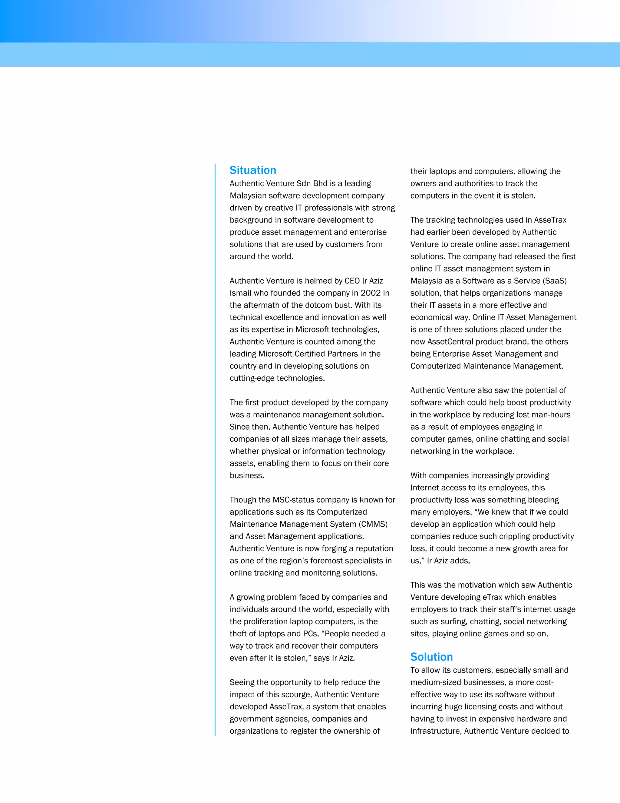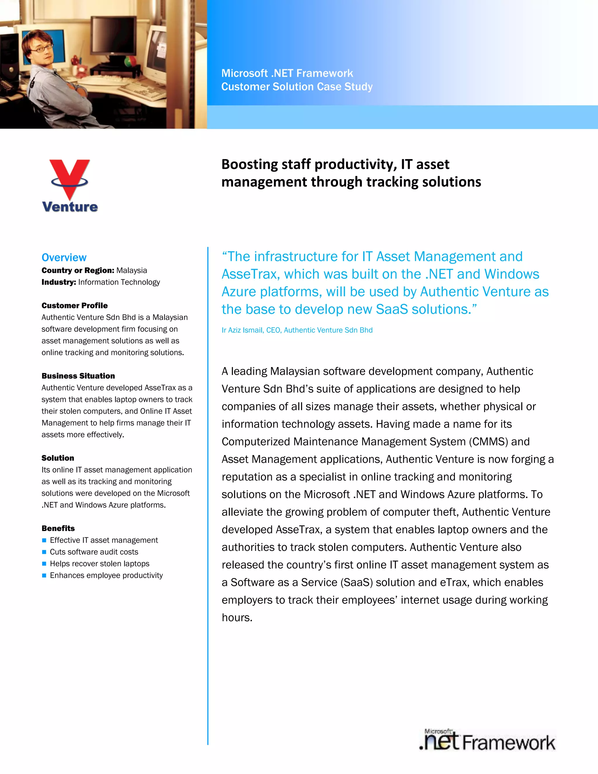 Authentic Venture developed tracking and asset management solutions using .NET and Azure to help companies manage IT assets and boost productivity. Their AsseTrax solution allows users to track stolen laptops, while their IT asset management application helps firms inventory software licenses and hardware. Authentic Venture also created eTrax to monitor employee internet usage and reduce unproductive time. Moving their applications to SaaS models on Azure provided benefits like lower costs and easier maintenance over on-premises options.