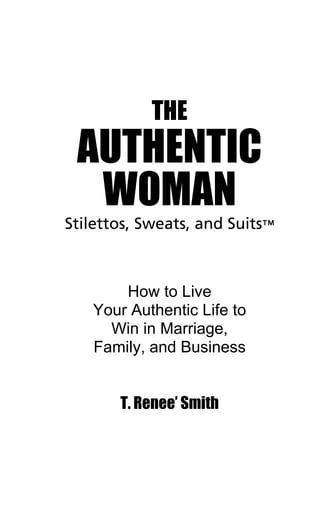 This document is an excerpt from the book "The Authentic Woman: Stilettos, Sweats, and Suits" by T. Renee' Smith. It discusses how to live an authentic life through being aware of one's true self, challenging limiting beliefs, and embracing truth. The author shares lessons from her own life experience overcoming hardships and finding purpose. She emphasizes designing one's business around their desired lifestyle, not competing with others, and using affirmations to program one's subconscious mind for success.