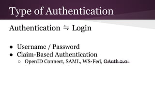 The document discusses claim-based authentication using standards like OAuth 2.0 and OpenID Connect. In claim-based authentication, an identity management service (IDP) stores and shares user attributes and claims with a web service (RP). The IDP verifies the user's identity and the web service receives and relies on the user's claims to provide access or make authorization decisions. The document warns that access tokens alone could be modified, so OpenID Connect is recommended as it includes ID tokens that can be verified for more secure authentication.
