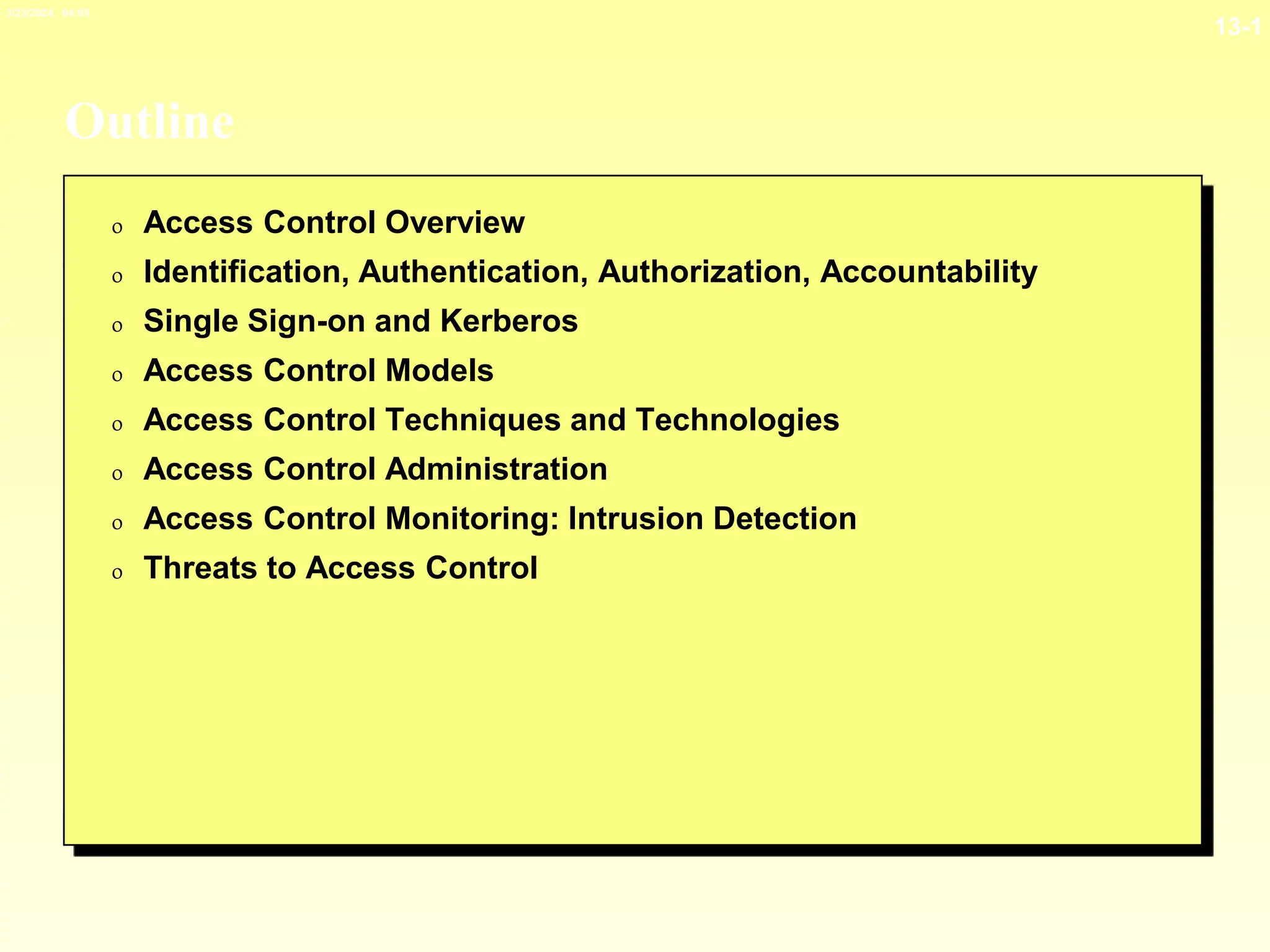 Access control systems provide identification, authentication, authorization and accountability. Identification and authentication determine who can log in, authorization determines what users can do, and accountability identifies what users have done. Single sign-on allows users to log in once and access multiple systems without additional logins. Kerberos is a network authentication protocol that allows nodes on a non-secure network to verify each other's identity securely using tickets and symmetric cryptography with help from a trusted third party.
