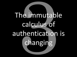 The document discusses the evolution of authentication methods, emphasizing the shift from traditional systems like passwords to modern solutions using biometrics and protocols such as FIDO. It outlines the components of identity assurance, the roles of primary and secondary authenticators, and various identity proofing techniques, highlighting the advantages of adaptive authentication and out-of-band proofing. The FIDO framework is presented as a significant advancement, with local mobile biometrics and universal second factor protocols aiming to enhance security and user experience.