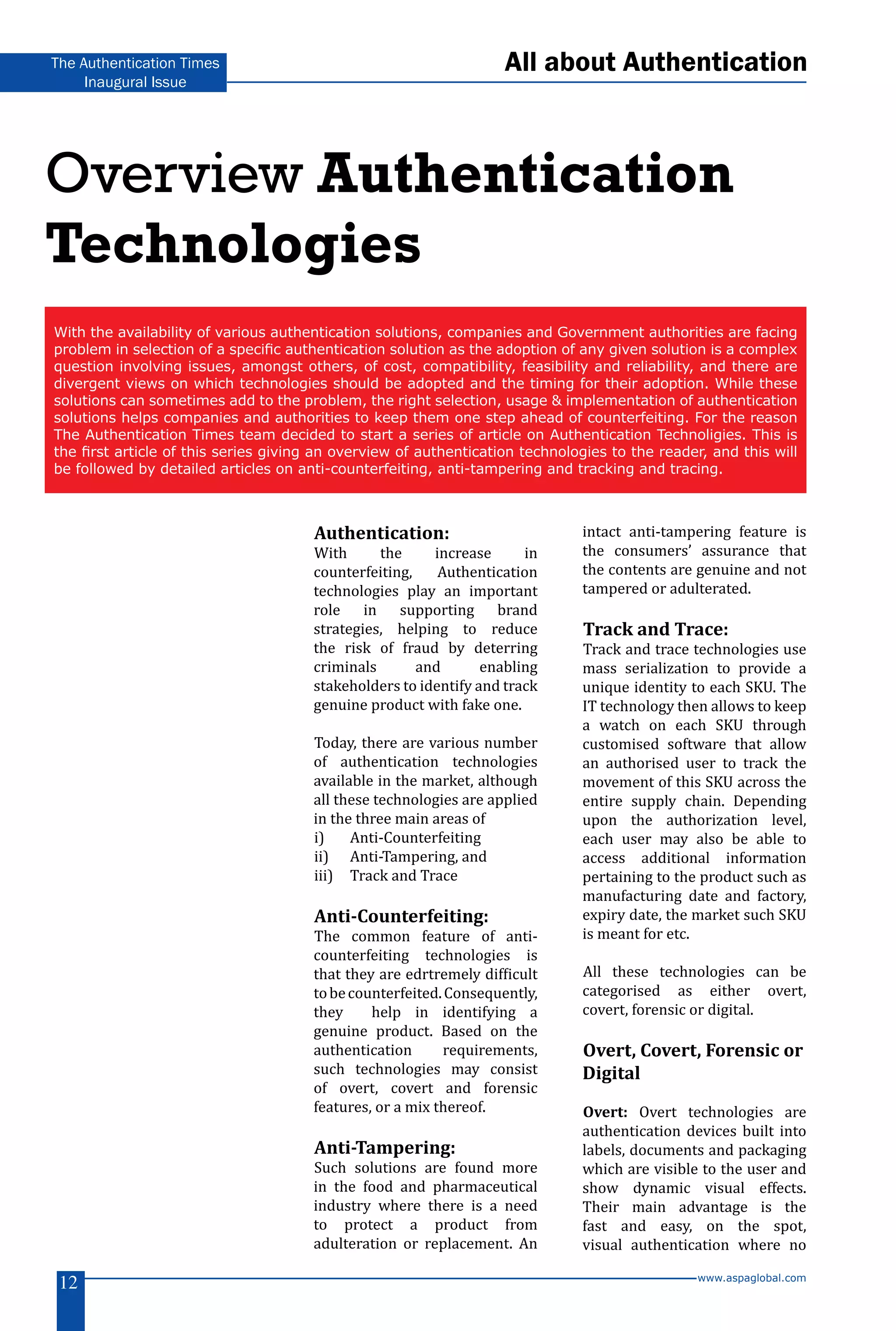 The document discusses the importance of authentication technologies in combating counterfeiting and fraud, highlighting three main areas: anti-counterfeiting, anti-tampering, and track and trace. It categorizes authentication methods into overt, covert, forensic, and digital technologies, explaining their roles and applications across different industries. The article emphasizes that a comprehensive brand protection strategy should involve a combination of technologies and adherence to standards like ISO:12931.