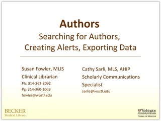 This document provides instructions for creating author alerts and exporting citations to Excel from the PubMed and Scopus databases. It discusses setting up a My NCBI account in PubMed to search for authors and create author alerts. Instructions are provided for exporting PubMed citations to RefWorks and then to Excel. For Scopus, it outlines how to register for a free account, search for authors, create and save search alerts by email or RSS, and export citations to Excel or EndNote. Caveats about author name variations and multiple author entries are also described.