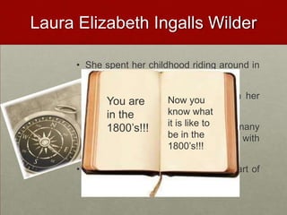 The document summarizes the book "Little House in the Big Woods" by Laura Ingalls Wilder. It describes the main characters of Laura and her family and their life living in a log cabin in Wisconsin in the 1870s. The story follows Laura as a young child and details her family's adventures as they work hard and try to survive the harsh winters together in the woods. The tone of the book and Laura's writing is cheerful and positive as it depicts the family's love and bond through challenging times on the American frontier.