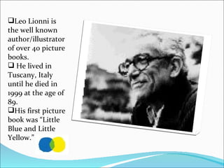 Leo Lionni was an Italian-American author and illustrator who created over 40 picture books for children. He was born in Holland in 1910 and taught himself to draw by spending time in museums. Some of his most famous books include Swimmy, Frederick, and Alexander and the Wind-Up Mouse. Lionni's stories often featured animal characters dealing with human problems and themes of cooperation. He was known for using collage techniques in his illustrations.