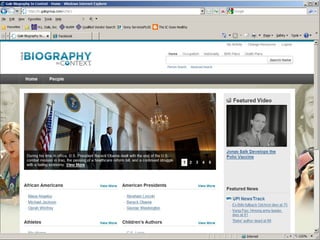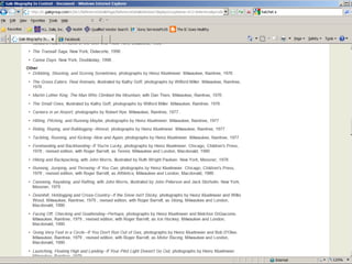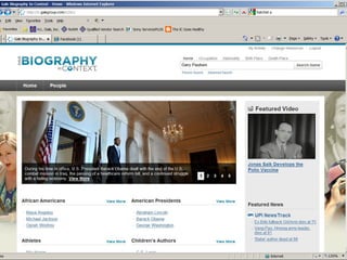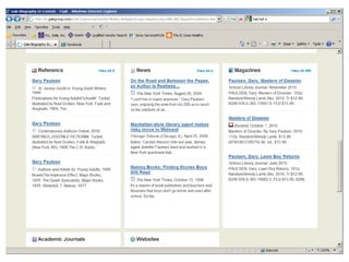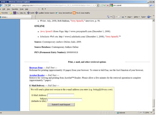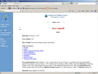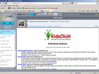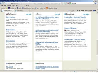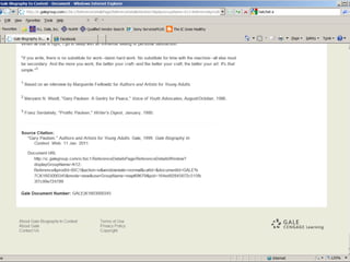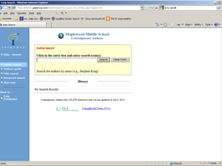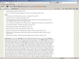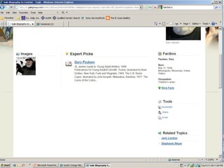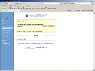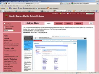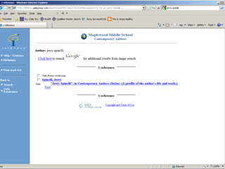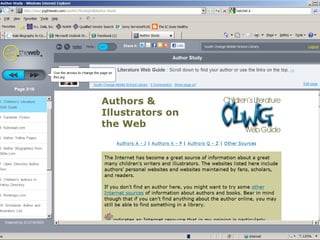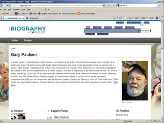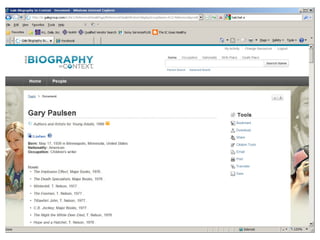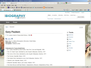 The document provides information on library resources that assist in studying contemporary authors. It highlights the usefulness of databases like Gale Biography Resource Center. Additionally, it suggests utilizing websites such as 'Jog the Web' for further research.