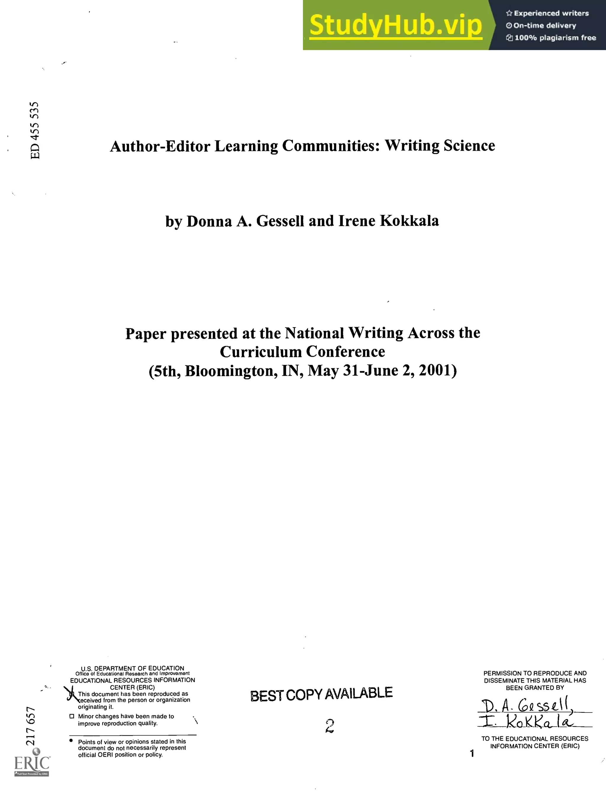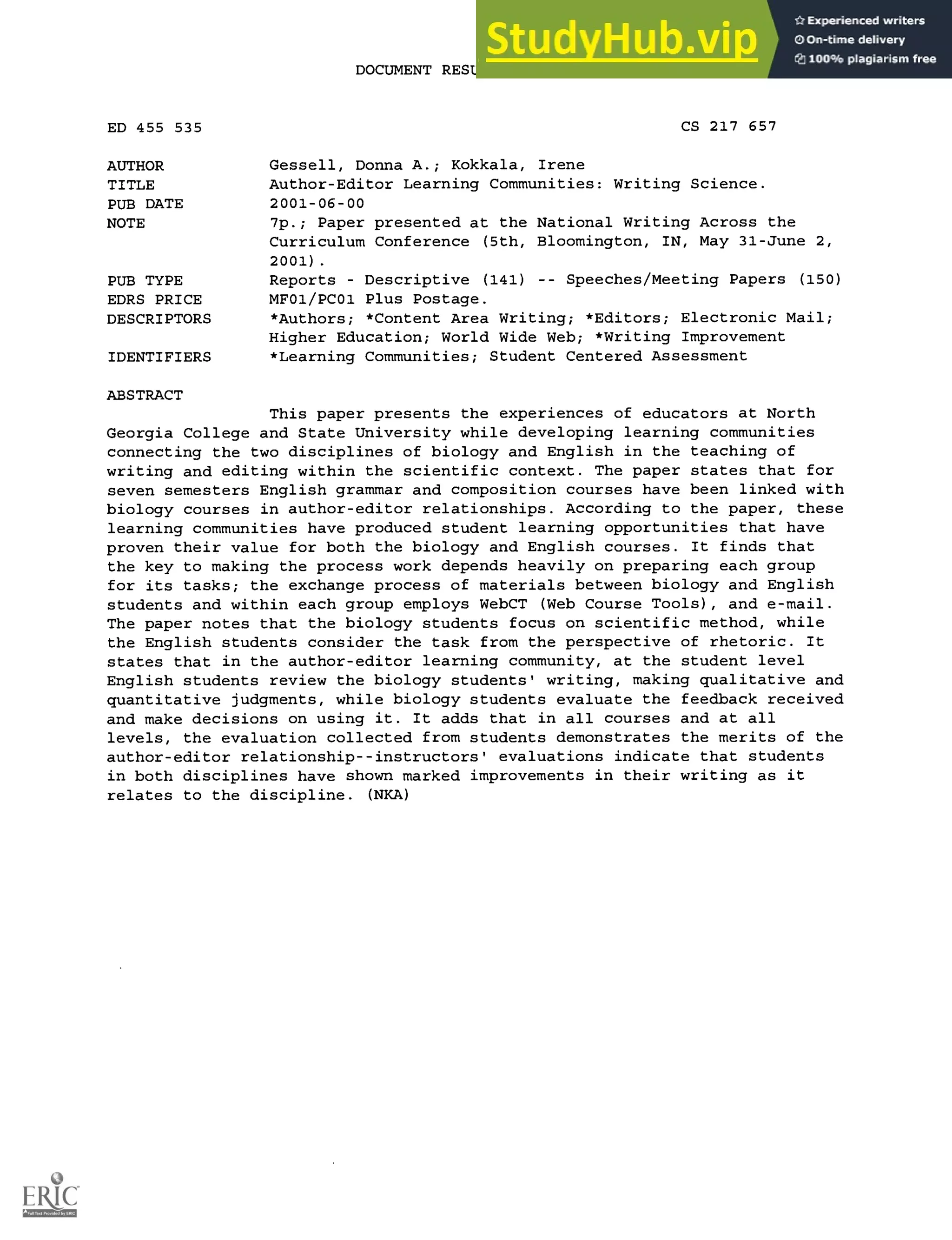 The document summarizes an author-editor learning community developed between biology and English courses at North Georgia College and State University. For seven semesters, English composition courses were linked with biology courses where students worked in groups with biology students as authors and English students as editors. The process involved biology students writing scientific manuscripts that were reviewed and critiqued by English student editors. Both sets of students improved their writing through this collaborative, interdisciplinary experience. Assessment occurred through student and instructor evaluations, which found benefits for writing development in both disciplines.