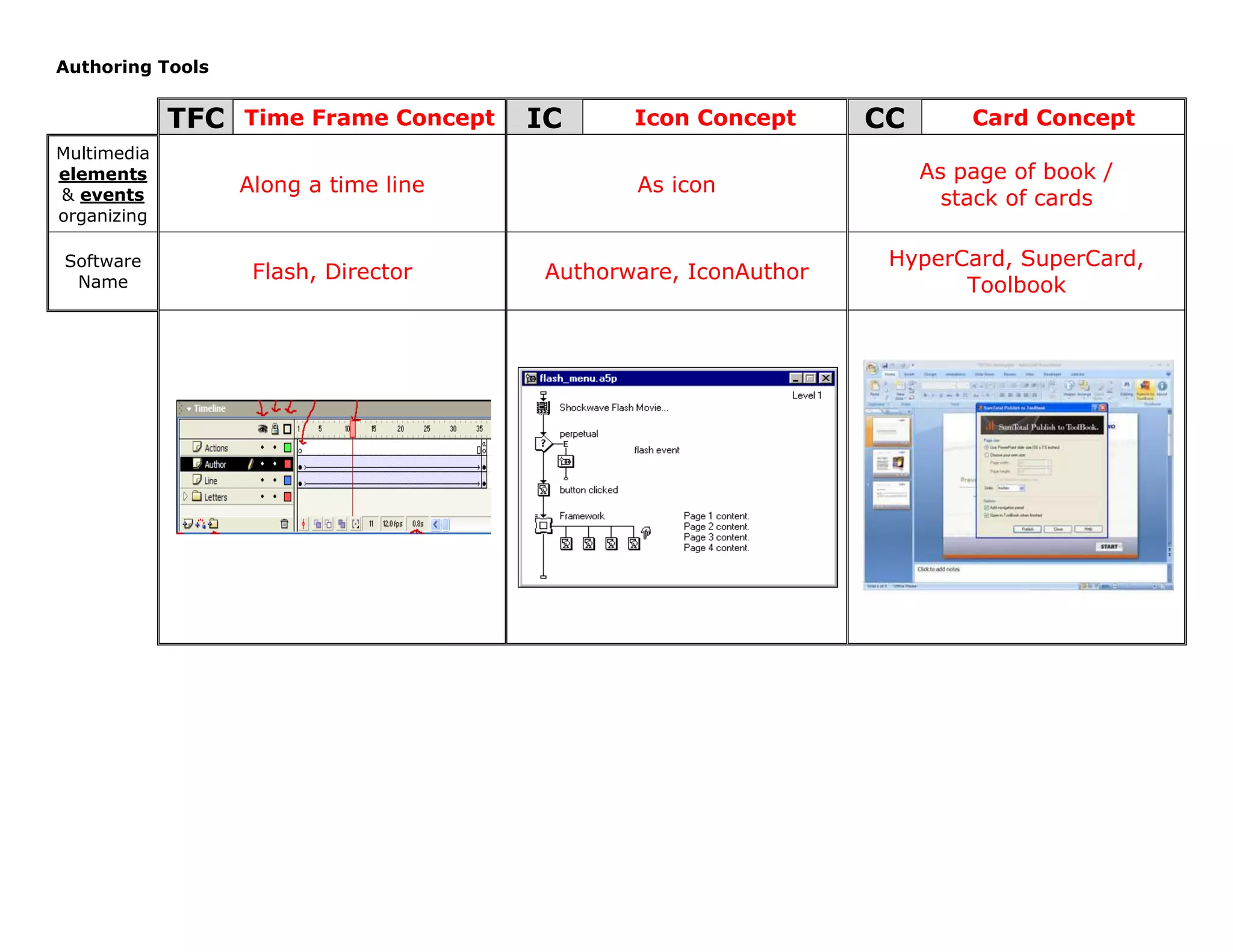 The document discusses different concepts for organizing multimedia elements and events along a timeline, as icons, or as pages in a book or cards in a stack. It lists some authoring tools that use these concepts, including Flash, Director, Authorware, and Icon for timeline and icon concepts, and HyperCard, SuperCard, and Toolbook for book/card concepts.