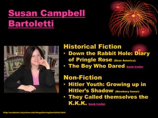 This document provides information on 14 young adult authors, including their websites and lists of genres and titles of some of their works. For each author, it lists genres they write in such as historical fiction, contemporary fiction, sports fiction, and mysteries. It provides 1-3 examples of titles and series for most of the authors. The authors are Susan Campbell Bartoletti, Gennifer Choldenko, Andrew Clements, Caroline B. Cooney, John Coy, Frances O'Roark Dowell, John Feinstein, Candace Fleming, Helen Frost, Lisa Graff, Margaret Peterson Haddix, Will Hobbs, Jennifer Holm, and Anthony Horowitz.